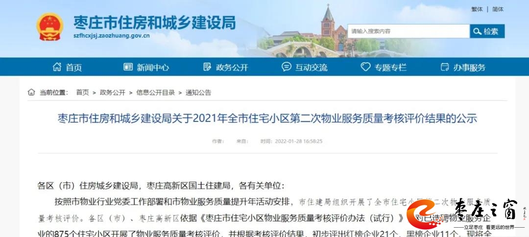 近日棗莊市住房和城鄉(xiāng)建設局發(fā)布《關于2021年全市住宅小區(qū)第二次物業(yè)服務質量考核評價結果的公示》
